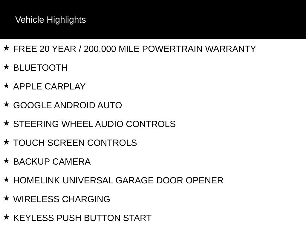 FREE 20 YEAR / 200,000 MILE POWERTRAIN WARRANTY, BLUETOOTH, APPLE CARPLAY, GOOGLE ANDROID AUTO, STEERING WHEEL AUDIO CONTROLS, TOUCH SCREEN CONTROLS, BACKUP CAMERA, HOMELINK UNIVERSAL GARAGE DOOR OPENER, WIRELESS CHARGING, KEYLESS PUSH BUTTON START, AUTOMATIC HEADLIGHTS, COLLISION AVOIDANCE SYSTEM, COLLISION WARNING ALERT SYSTEM, POWER DRIVER SEAT, PANORAMIC SUNROOF/MOONROOF, REMOTE START, POWER LIFTGATE, HEATED FRONT LEATHERETTE SEATS, RS SERIES, CONVENIENCE PACKAGE, DRIVER CONFIDENCE PACKAGE, PREFERRED EQUIPMENT PACKAGE 1RS, 19" HIGH GLOSS BLACK MACHINED ALUMINUM WHEELS, AIR CONDITIONING, BRAKE ASSIST, CABIN HUMIDITY SENSOR, COMPASS, DELAY-OFF HEADLIGHTS, DRIVER VANITY MIRROR, EMERGENCY COMMUNICATION SYSTEM: ONSTAR AND CHEVROLET CONNECTED SERVICES CAPABLE, ENHANCED PERFORMANCE 6-SPEAKER AUDIO SYSTEM, EXTERIOR PARKING CAMERA REAR, FLAT-FOLDING FRONT PASSENGER SEATBACK, FRONT LICENSE PLATE BRACKET, HEATED DOOR MIRRORS, LOW TIRE PRESSURE WARNING, OCCUPANT SENSING AIRBAG, OVERHEAD CONSOLE, PANIC ALARM, PASSENGER VANITY MIRROR, POWER DOOR MIRRORS, POWER WINDOWS, REAR PARK ASSIST, REAR WINDOW DEFROSTER, REAR WINDOW WIPER, REMOTE KEYLESS ENTRY, RIDE & HANDLING SUSPENSION, SINGLE-ZONE AUTOMATIC CLIMATE CONTROL, SPEED CONTROL, TELESCOPING STEERING WHEEL, TILT STEERING WHEEL, VARIABLY INTERMITTENT WIPERS.
