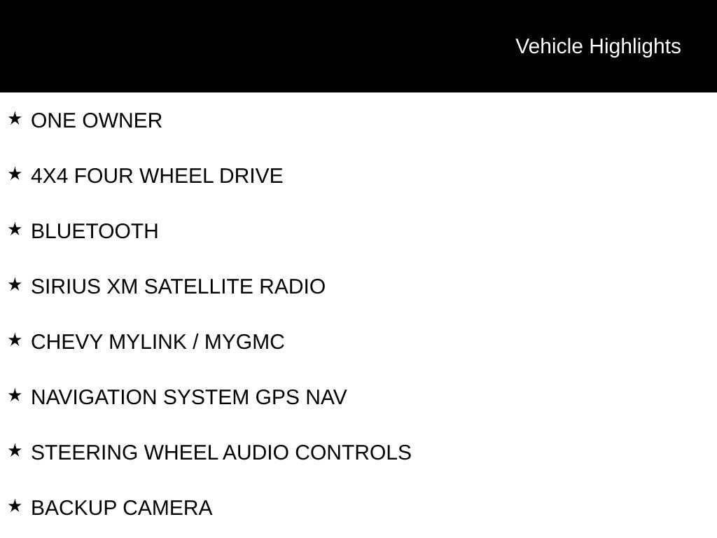 ONE OWNER, 4X4 FOUR WHEEL DRIVE, BLUETOOTH, SIRIUS XM SATELLITE RADIO, CHEVY MYLINK / MYGMC, NAVIGATION SYSTEM GPS NAV, STEERING WHEEL AUDIO CONTROLS, BACKUP CAMERA, HOMELINK UNIVERSAL GARAGE DOOR OPENER, WIRELESS CHARGING, WI-FI HOTSPOT, POWER DRIVER SEAT, POWER PASSENGER SEAT, HEATED FRONT CLOTH SEATS, REMOTE START, TOW PACKAGE / TRAILER PACKAGE, RUNNING BOARDS, ALL WEATHER FLOOR MATS, LT SERIES, ALL STAR EDITION, LT PLUS PACKAGE, TRAILERING PACKAGE, PREFERRED EQUIPMENT PACKAGE 2LT, 20 POLISHED ALUMINUM WHEELS, 110-VOLT AC POWER OUTLET, 150 AMP ALTERNATOR, 3.42 REAR AXLE RATIO, 6 SPEAKER AUDIO SYSTEM, AIR CONDITIONING, BODY COLOR REAR BUMPER W/CORNERSTEPS, BODY-COLOR GRILLE SURROUND, BODY-COLOR HEADLAMP BEZELS, BRAKE ASSIST, COMPASS, DEEP-TINTED GLASS, DELAY-OFF HEADLIGHTS, DRIVER VANITY MIRROR, DUAL FRONT IMPACT AIRBAGS, DUAL FRONT SIDE IMPACT AIRBAGS, DUAL-ZONE AUTOMATIC CLIMATE CONTROL, ELECTRIC REAR-WINDOW DEFOGGER, EZ LIFT & LOWER TAILGATE, FRONT CHROME BUMPER, FRONT WHEEL INDEPENDENT SUSPENSION, HEATED DOOR MIRRORS, HIGH-INTENSITY DISCHARGE HEADLIGHTS, LOW TIRE PRESSURE WARNING, MANUAL TILT/TELESCOPING STEERING COLUMN, OUTSIDE TEMPERATURE DISPLAY, OVERHEAD CONSOLE, PANIC ALARM, PASSENGER VANITY MIRROR, POWER DOOR MIRRORS, POWER WINDOWS, PREMIUM AUDIO SYSTEM: CHEVROLET MYLINK, REAR 60/40 FOLDING BENCH SEAT (FOLDS UP), REAR WHEELHOUSE LINERS, REMOTE KEYLESS ENTRY, REMOTE LOCKING TAILGATE, SPEED CONTROL, SPEED-SENSING STEERING, TILT STEERING WHEEL, VARIABLY INTERMITTENT WIPERS.