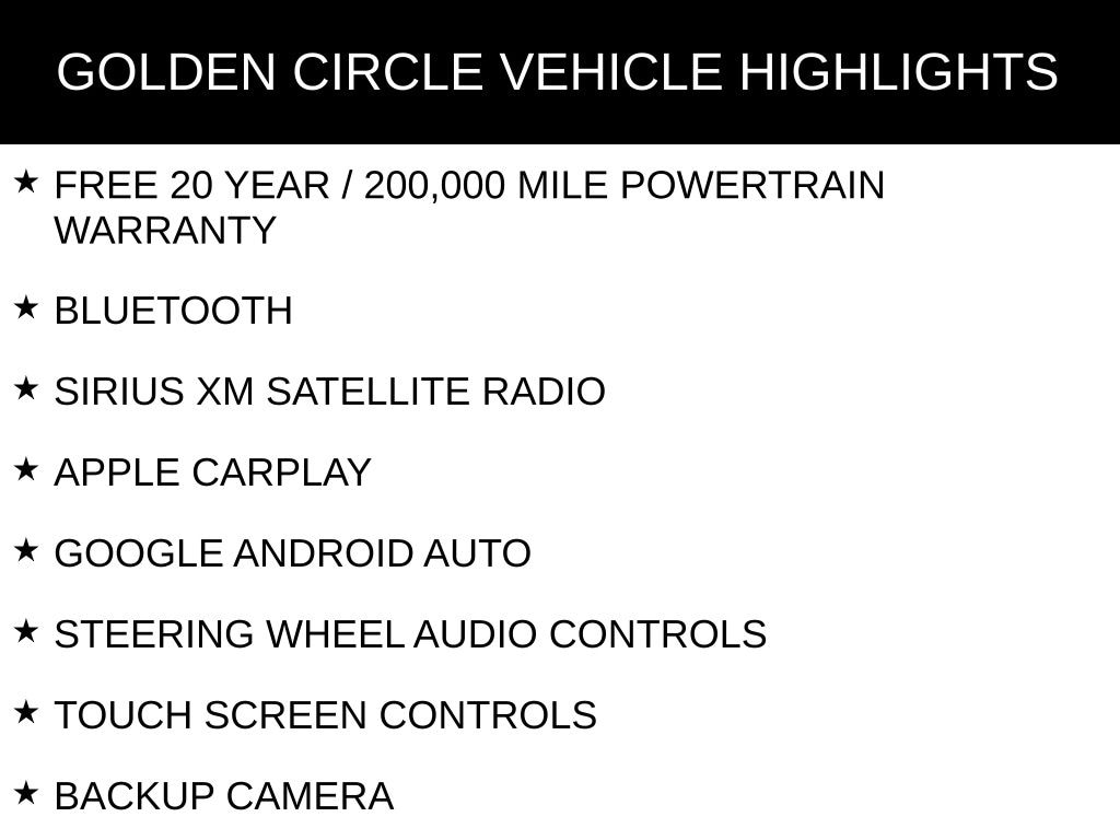 FREE 20 YEAR / 200,000 MILE POWERTRAIN WARRANTY, BLUETOOTH, SIRIUS XM SATELLITE RADIO, APPLE CARPLAY, GOOGLE ANDROID AUTO, STEERING WHEEL AUDIO CONTROLS, TOUCH SCREEN CONTROLS, BACKUP CAMERA, HOMELINK UNIVERSAL GARAGE DOOR OPENER, WI-FI HOTSPOT, KEYLESS PUSH BUTTON START, AUTOMATIC HEADLIGHTS, POWER DRIVER SEAT, REMOTE START, POWER LIFTGATE, ALPINE HIGH END SOUND PACKAGE / 6 SPEAKERS, GT SERIES, 20" SATIN CARBON PAINTED WHEELS, 6 SPEAKERS, AIR CONDITIONING, ANTI-WHIPLASH FRONT HEAD RESTRAINTS, AUTO-DIMMING REAR-VIEW MIRROR, AUTOMATIC TEMPERATURE CONTROL, BRAKE ASSIST, COMPASS, DELAY-OFF HEADLIGHTS, DRIVER VANITY MIRROR, EMERGENCY COMMUNICATION SYSTEM: SIRIUSXM GUARDIAN, FOUR WHEEL INDEPENDENT SUSPENSION, FRONT DUAL ZONE A/C, FRONT LICENSE PLATE BRACKET, HEATED DOOR MIRRORS, LOW TIRE PRESSURE WARNING, OCCUPANT SENSING AIRBAG, OUTSIDE TEMPERATURE DISPLAY, OVERHEAD CONSOLE, PANIC ALARM, PASSENGER VANITY MIRROR, POWER DOOR MIRRORS, POWER WINDOWS, REAR WINDOW DEFROSTER, REMOTE KEYLESS ENTRY, SPEED CONTROL, SPEED-SENSITIVE WIPERS, TELESCOPING STEERING WHEEL, TILT STEERING WHEEL, VARIABLY INTERMITTENT WIPERS.