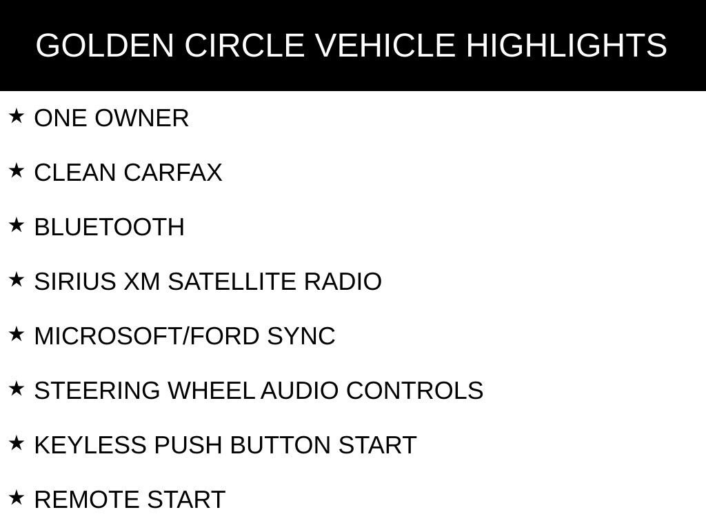 ONE OWNER, CLEAN CARFAX, BLUETOOTH, SIRIUS XM SATELLITE RADIO, MICROSOFT/FORD SYNC, STEERING WHEEL AUDIO CONTROLS, KEYLESS PUSH BUTTON START, REMOTE START, POWER LIFTGATE, SE SERIES, EQUIPMENT PACKAGE 201A, 17 ALLOY SPARKLE SILVER WHEELS, 6 SPEAKERS, AIR CONDITIONING, BRAKE ASSIST, BUMPERS: BODY-COLOR, CD PLAYER, COMPASS, DELAY-OFF HEADLIGHTS, DRIVER VANITY MIRROR, DUAL FRONT IMPACT AIRBAGS, DUAL FRONT SIDE IMPACT AIRBAGS, ELECTRONIC STABILITY CONTROL, FRONT CENTER ARMREST, FRONT FOG LIGHTS, LOW TIRE PRESSURE WARNING, OCCUPANT SENSING AIRBAG, OUTSIDE TEMPERATURE DISPLAY, OVERHEAD CONSOLE, PANIC ALARM, PASSENGER VANITY MIRROR, POWER DOOR MIRRORS, POWER WINDOWS, REAR WINDOW DEFROSTER, REAR WINDOW WIPER, REMOTE KEYLESS ENTRY, TELESCOPING STEERING WHEEL, TILT STEERING WHEEL, VARIABLY INTERMITTENT WIPERS.
