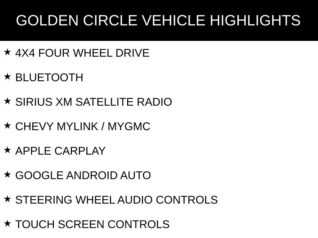 4X4 FOUR WHEEL DRIVE, 3.0L I6 TURBO-DIESEL ENGINE, CUSTOM BED COVER, BLUETOOTH, SIRIUS XM SATELLITE RADIO, CHEVY MYLINK / MYGMC, APPLE CARPLAY, GOOGLE ANDROID AUTO, STEERING WHEEL AUDIO CONTROLS, TOUCH SCREEN CONTROLS, BACKUP CAMERA, WI-FI HOTSPOT, KEYLESS PUSH BUTTON START, POWER DRIVER SEAT, HEATED FRONT CLOTH SEATS, REMOTE START, TOW PACKAGE / TRAILER PACKAGE, ELEVATION SERIES, CLOTH REAR SEAT W/ STORAGE PACKAGE, ELEVATION CONVENIENCE PACKAGE, ELEVATION VALUE PACKAGE, PREFERRED EQUIPMENT PACKAGE 3SB, TRAILERING PACKAGE, X31 OFF-ROAD PACKAGE, 20" BLACK GLOSS PAINTED ALUMINUM WHEELS, 3.23 REAR AXLE RATIO, 6-SPEAKER AUDIO SYSTEM FEATURE, AIR CONDITIONING, AUTOMATIC TEMPERATURE CONTROL, BODY-COLOR SURROUND GRILLE, BRAKE ASSIST, CLOTH SEAT TRIM, COMPASS, DEEP-TINTED GLASS, DELAY-OFF HEADLIGHTS, DRIVER VANITY MIRROR, DUAL EXHAUST W/PREMIUM TIPS, DUAL FRONT IMPACT AIRBAGS, DUAL FRONT SIDE IMPACT AIRBAGS, DUAL-ZONE AUTOMATIC CLIMATE CONTROL, ELECTRIC REAR-WINDOW DEFOGGER, ELECTRICAL LOCK CONTROL STEERING COLUMN, FRONT DUAL ZONE A/C, FRONT FOG LIGHTS, FRONT FRAME-MOUNTED BLACK RECOVERY HOOKS, FRONT WHEEL INDEPENDENT SUSPENSION, HEATED DOOR MIRRORS, HEAVY DUTY SUSPENSION, HEAVY-DUTY AIR FILTER, HILL DESCENT CONTROL, HITCH GUIDANCE, KEYLESS OPEN & START, LOW TIRE PRESSURE WARNING, OCCUPANT SENSING AIRBAG, OFF-ROAD SUSPENSION, OUTSIDE TEMPERATURE DISPLAY, OVERHEAD CONSOLE, PASSENGER VANITY MIRROR, POWER DOOR LOCKS, POWER DOOR MIRRORS, POWER WINDOWS, REAR STEP BUMPER, REAR WHEELHOUSE LINERS, REAR WINDOW DEFROSTER, REMOTE KEYLESS ENTRY, SPEED CONTROL, SPEED-SENSING STEERING, STANDARD TAILGATE, TELESCOPING STEERING WHEEL, THEFT DETERRENT SYSTEM (UNAUTHORIZED ENTRY), TILT STEERING WHEEL, VARIABLY INTERMITTENT WIPERS.