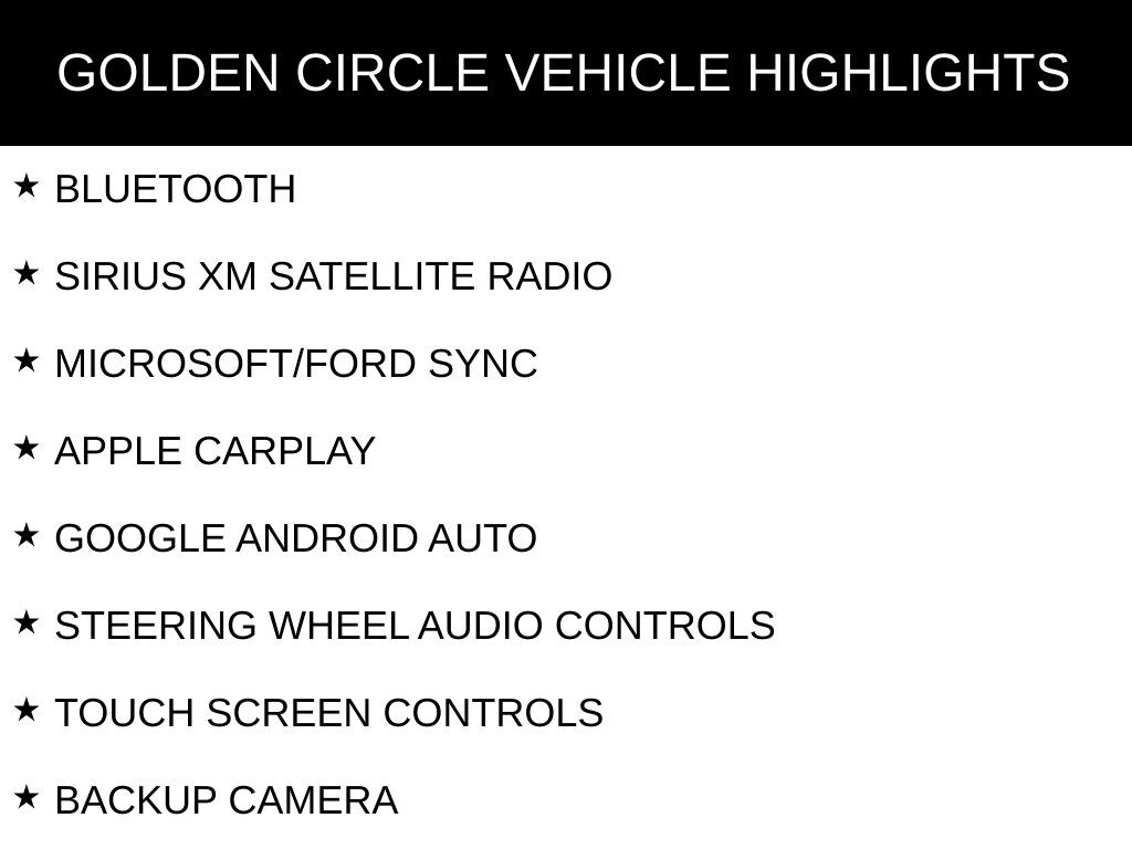BLUETOOTH, SIRIUS XM SATELLITE RADIO, MICROSOFT/FORD SYNC, APPLE CARPLAY, GOOGLE ANDROID AUTO, STEERING WHEEL AUDIO CONTROLS, TOUCH SCREEN CONTROLS, BACKUP CAMERA, HOMELINK UNIVERSAL GARAGE DOOR OPENER, WI-FI HOTSPOT, KEYLESS PUSH BUTTON START, AUTOMATIC HEADLIGHTS, POWER DRIVER SEAT, POWER PASSENGER SEAT, HEATED FRONT LEATHER SEATS, MEMORY PACKAGE / MEMORY SEAT, REMOTE START, POWER LIFTGATE, STANDARD SERIES, EQUIPMENT PACKAGE 100A, 18" PREMIUM MAGNETIC PAINTED ALUMINUM WHEELS, 10 SPEAKERS, AIR CONDITIONING, AUTO TILT-AWAY STEERING WHEEL, AUTO-DIMMING DOOR MIRRORS, AUTO-DIMMING REAR-VIEW MIRROR, AUTOMATIC TEMPERATURE CONTROL, BRAKE ASSIST, COMPASS, DELAY-OFF HEADLIGHTS, DRIVER VANITY MIRROR, EMERGENCY COMMUNICATION SYSTEM: SYNC 3 911 ASSIST, FOUR WHEEL INDEPENDENT SUSPENSION, FRONT DUAL ZONE A/C, GENUINE WOOD CONSOLE INSERT, GENUINE WOOD DASHBOARD INSERT, HEATED DOOR MIRRORS, HIGH-INTENSITY DISCHARGE HEADLIGHTS, LEATHER STEERING WHEEL, LOW TIRE PRESSURE WARNING, OCCUPANT SENSING AIRBAG, OUTSIDE TEMPERATURE DISPLAY, OVERHEAD CONSOLE, PANIC ALARM, PASSENGER VANITY MIRROR, POWER DOOR MIRRORS, RAIN SENSING WIPERS, REAR WINDOW DEFROSTER, SPEED CONTROL, SPEED-SENSING STEERING, SPLIT FOLDING REAR SEAT, STEERING WHEEL MEMORY, STEERING WHEEL MOUNTED A/C CONTROLS, TELESCOPING STEERING WHEEL, TILT STEERING WHEEL, TURN SIGNAL INDICATOR MIRRORS, VARIABLY INTERMITTENT WIPERS.