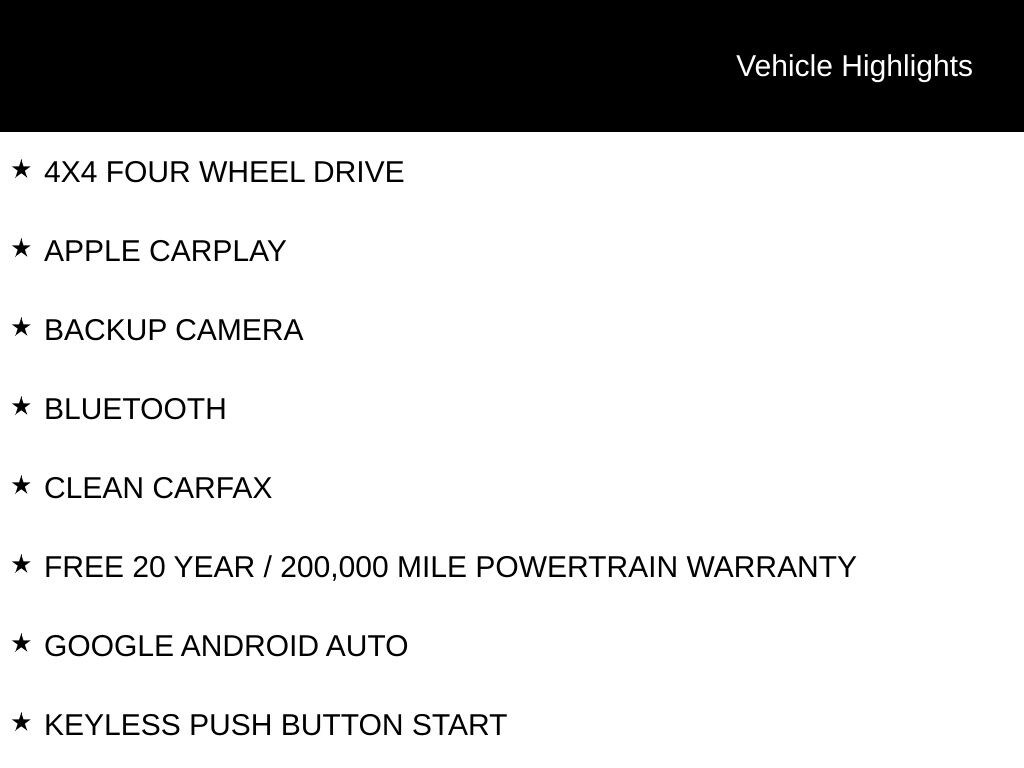 FREE 20 YEAR / 200,000 MILE POWERTRAIN WARRANTY, ONE OWNER, CLEAN CARFAX, 4X4 FOUR WHEEL DRIVE, BLUETOOTH, SIRIUS XM SATELLITE RADIO, APPLE CARPLAY, GOOGLE ANDROID AUTO, STEERING WHEEL AUDIO CONTROLS, TOUCH SCREEN CONTROLS, BACKUP CAMERA, KEYLESS PUSH BUTTON START, TOW PACKAGE / TRAILER PACKAGE, SV SERIES, 18" PAINTED & MACHINED ALLOY WHEELS, 6 SPEAKERS, AIR CONDITIONING, AUTO HIGH-BEAM HEADLIGHTS, BLIND SPOT WARNING, BRAKE ASSIST, DUAL FRONT IMPACT AIRBAGS, DUAL FRONT SIDE IMPACT AIRBAGS, ELECTRONIC STABILITY CONTROL, FRONT CENTER ARMREST W/STORAGE, HEATED DOOR MIRRORS, LOW TIRE PRESSURE WARNING, OCCUPANT SENSING AIRBAG, OUTSIDE TEMPERATURE DISPLAY, OVERHEAD CONSOLE, PANIC ALARM, PASSENGER VANITY MIRROR, POWER DOOR MIRRORS, POWER WINDOWS, REAR PARKING SENSORS, REAR STEP BUMPER, REAR WINDOW DEFROSTER, REMOTE KEYLESS ENTRY, SECURITY SYSTEM, SPEED CONTROL, SPEED-SENSING STEERING, SPEED-SENSITIVE WIPERS, TELESCOPING STEERING WHEEL, TILT STEERING WHEEL, VARIABLY INTERMITTENT WIPERS.
