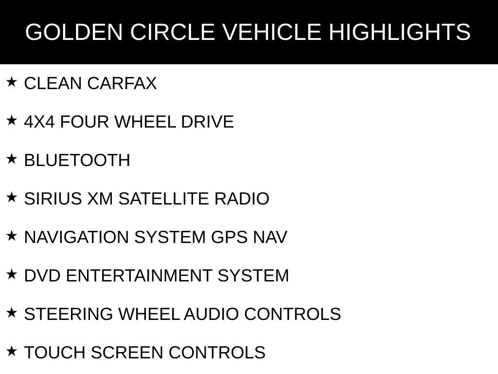 CLEAN CARFAX, 4X4 FOUR WHEEL DRIVE, BLUETOOTH, SIRIUS XM SATELLITE RADIO, NAVIGATION SYSTEM GPS NAV, DVD ENTERTAINMENT SYSTEM, STEERING WHEEL AUDIO CONTROLS, TOUCH SCREEN CONTROLS, BACKUP CAMERA, HOMELINK UNIVERSAL GARAGE DOOR OPENER, POWER DRIVER SEAT, POWER PASSENGER SEAT, HEATED/COOLED LEATHER SEATS, HEATED REAR LEATHER SEATS, 3RD ROW SEAT, SUNROOF/MOONROOF, MEMORY PACKAGE / MEMORY SEAT, RUNNING BOARDS, WEATHERTECH ALL WEATHER FLOOR MATS, JBL HIGH END SOUND PACKAGE / 14 SPEAKERS, PLATINUM SERIES, 20 ALLOY WHEELS, AIR CONDITIONING, AUTO-DIMMING DOOR MIRRORS, AUTO-DIMMING REAR-VIEW MIRROR, AUTO-LEVELING SUSPENSION, AUTOMATIC TEMPERATURE CONTROL, BRAKE ASSIST, CD PLAYER, COMPASS, DRIVER VANITY MIRROR, DUAL FRONT IMPACT AIRBAGS, DUAL FRONT SIDE IMPACT AIRBAGS, FOUR WHEEL INDEPENDENT SUSPENSION, FRONT DUAL ZONE A/C, FRONT FOG LIGHTS, FULLY AUTOMATIC HEADLIGHTS, HEADLIGHT CLEANING, HEATED DOOR MIRRORS, LEATHER STEERING WHEEL, LOW TIRE PRESSURE WARNING, OCCUPANT SENSING AIRBAG, OUTSIDE TEMPERATURE DISPLAY, OVERHEAD AIRBAG, OVERHEAD CONSOLE, PANIC ALARM, PASSENGER VANITY MIRROR, POWER DOOR MIRRORS, POWER WINDOWS, REAR AIR CONDITIONING, REAR WINDOW DEFROSTER, REAR WINDOW WIPER, RECLINING 3RD ROW SEAT, REMOTE KEYLESS ENTRY, SPEED CONTROL, SPEED-SENSING STEERING, STEERING WHEEL MOUNTED A/C CONTROLS, TELESCOPING STEERING WHEEL, TILT STEERING WHEEL, TURN SIGNAL INDICATOR MIRRORS, VARIABLY INTERMITTENT WIPERS.